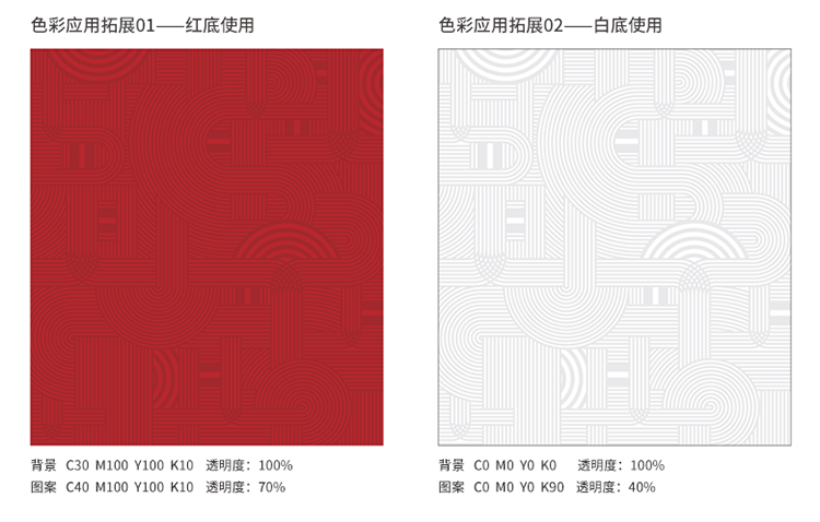 辅助图形可在两种底色上运用,即辅助色红色底与白色底上使用。当在辅助色红色底上使用时,辅助图形色彩为标准色红色并将透明度降低至70%;当在白色底上使用时,辅助图形色彩K90的灰色,透明度降低至10%。