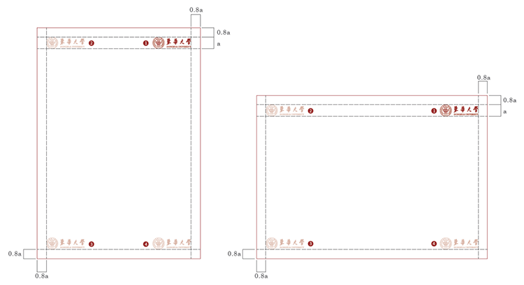 我们在版面中具体定义了标识与版面边缘的距离,即以校徽的高度为一个单位a,其所在画面中的位置与版面边缘的距离不能小于0.8a,请严格按照规范使用制作。