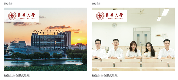 校徽在图片中使用时分为两种情况——浅色背景与深色背景。当标志在浅色背景与深色背景上使用时,为保证标志的识别度,请如右侧所示,将标志放置透明度为90%的白色品牌框中使用。