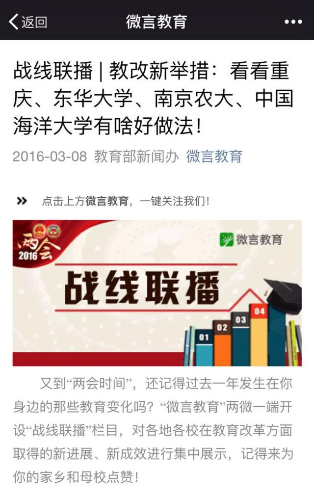 近日,全国“两会”召开,教育部新闻办微信公众号“微言教育”开设“战线联播”栏目,对各地高校在教育改革方面取得的新进展、新成效进行集中展示,于3月8日对我校学科发展聚焦科学前沿关注并报道。