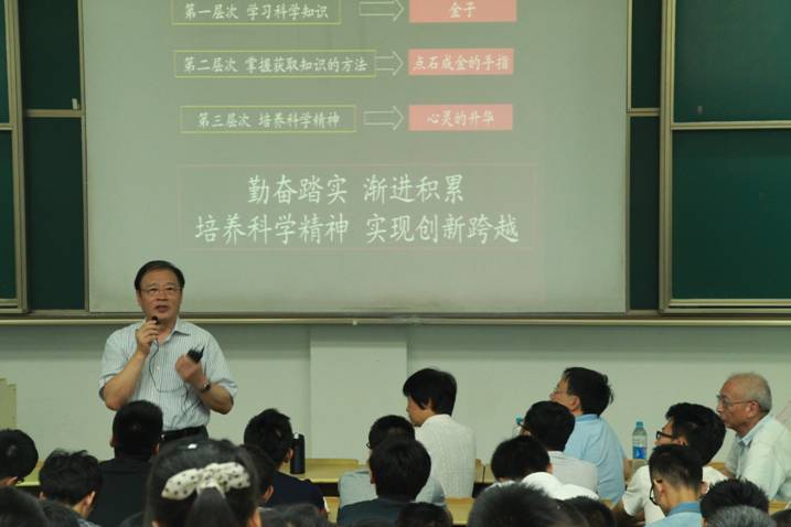 9月15日,理学院2014级新生迎新会在第一教学楼1137教室举行,中国科学院院士、我校理学院院长褚君浩为新生讲授了题为《远志、勤奋、好奇、美德》的讲座。理学院常务副院长张菁,党总支书记陈小立以及多名学院负责同志和教授出席了本次迎新会。