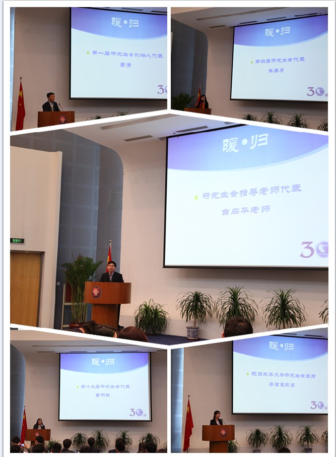 会上,上海市学生联合会驻会主席朱薛伟对我校研究生会成立30周年表示祝贺。第一届研究生会创始人代表、《研究生》杂志的创刊人李青,第四届研究生会主席、现材料学院院长朱美芳,第十三届研究生会代表董明敏,现任研究生会主席华芸萱及研究生会指导老师代表、现上海市教育总工会副主席吉启华分别发言,共同追溯了自己与研究生会的情缘,现场气氛温暖热烈。