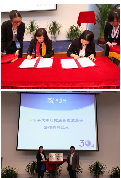 由第十六届研究生会发起的研究生会校友基金在会上正式成立,校研究生部副主任俞昊和校发展联络处处长、校友会秘书长、校教育发展基金会秘书长徐晶为研究生会校友基金成立揭牌。基金会旨在促进研会品牌活动创建、表彰研会优秀成员、帮助研会困难成员更好完成学业的。徐晶和朱美芳共同为研究生会校友基金成立签约。