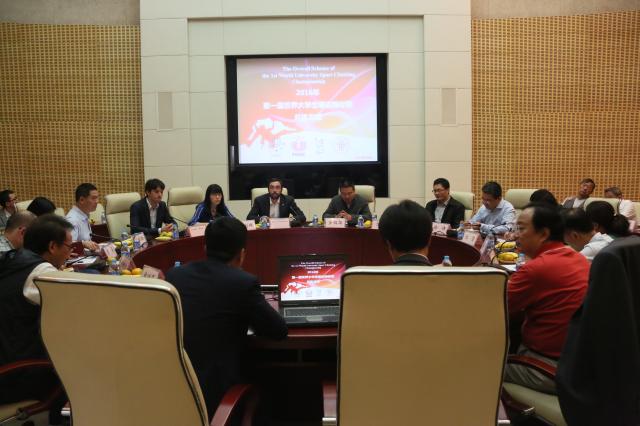 罗仪华在会上讲话,代表学校对检查组以及参与筹备工作的组委会成员表示感谢,希望学校在国际大学生体育联合会、国际攀岩联合会的帮助下,在教育部学生体协和上海市教委的指导下,加强与各方的协调沟通、合力办好此次赛事。朱江华代表赛事组委会从组委会成员、活动运营、活动宣传、赛事场地设计、活动保障、志愿者工作等六个方面对筹备工作进行了总体汇报。