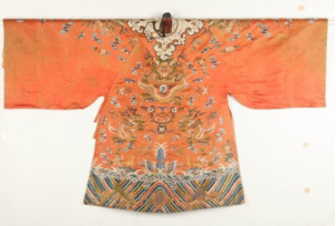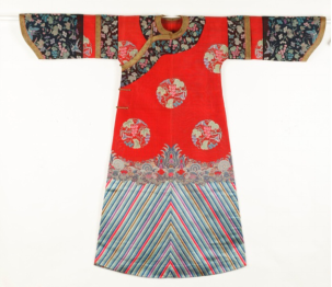 另一件红色缎地刺绣披肩领女龙袍则颇为宽大,鱼肚袖,披肩领,腋下系带。面料用红色缎地,绣龙纹、云纹、暗八仙纹、海水江崖纹,下幅海水中绣狮子纹一对,水面上盘金绣鹤鹿同春纹。披肩领用白色缎地,绣四季花卉纹。此件女龙袍款式上与明代女子穿用的大袖衣颇为相似,从传世的清代人物画像中也可见汉族女子穿用此类龙袍。因而据专家推测,此衣为汉族女子穿用,体现了清代满汉服饰的并存。清早期推行的“剃发易服”政策遭到汉人的抵制,相传清政府采纳了“十从十不从”的政策,其中之一便是“男从女不从”,即男子必须统一穿着满服,而汉族女子服饰则可有所保留。此件汉族女子穿用的龙袍见证了这一说法。