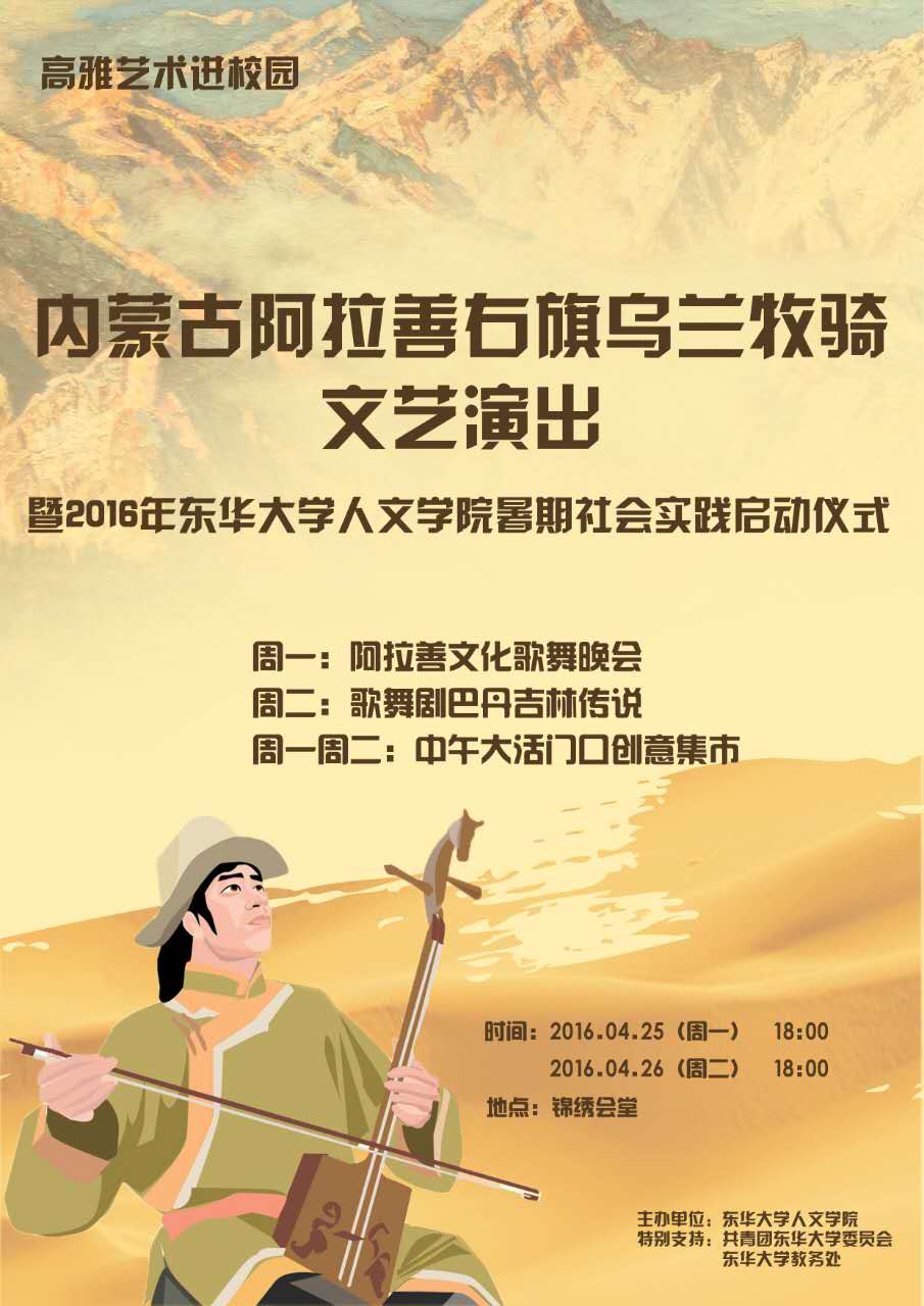 苍天圣地阿拉善,世界非遗进校园。由人文学院主办,共青团委员会、教务处特别支持的高雅艺术进校园——内蒙古阿拉善右旗乌兰牧骑文艺演出暨2016人文学院暑期社会实践启动仪式,将于4月25日、4月26日在我校松江校区锦绣会堂举行,乌兰牧骑文工团将为我们呈现两场草原文化的视听盛宴。