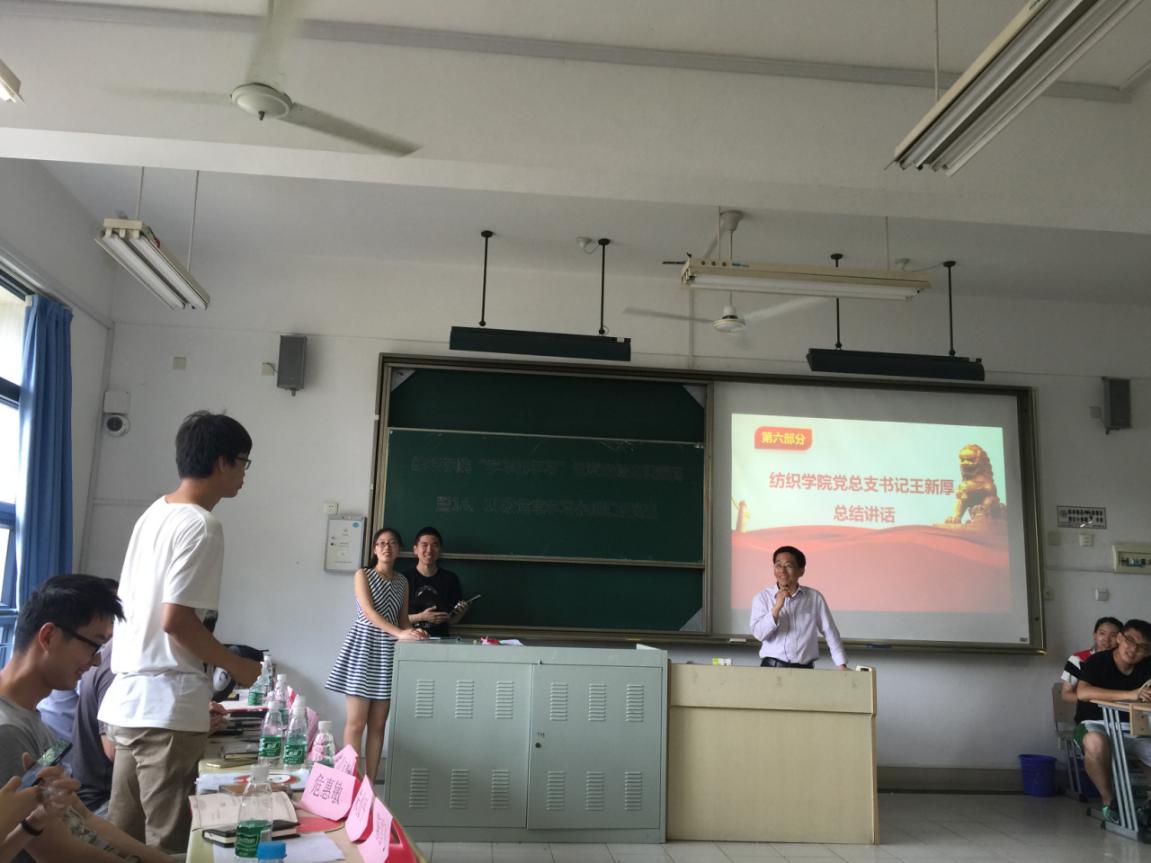 王新厚对活动进行了总结。他从创新性上给予本次活动高度好评,强调了学党章党规新形式的必要性。他还以“中国共产党的性质”发问,与在场同学互动,并借此指出,学习党章要以认识党的性质为基础展开深入细致的学习,要坚定实现共产主义的信念,边学边做,在学风建设、品德修炼上做好榜样,起到带头作用,为建设纺院的宏伟蓝图而努力。