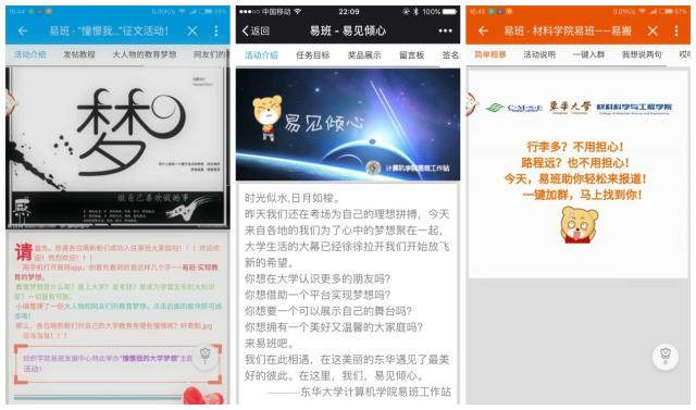 上海国际时尚创意学院和校易班发展中心发起的“易设计”系列活动,将班服设计比赛和校园环保袋设计大赛搬上了易班,通过线上投稿评比,开学当天新生设计的获奖作品就能出现在的校园中;化工与生物学院和纺织学院“易榜样·赢在起跑线”系列活动,既有大学生年度人物的寄语,又有职业规划大赛获奖作品的展现,通过“老腊肉”的“现身说法”,大学新生向朋辈榜样学习,明确目标,提早规划大学的学涯、生涯,努力成长为自己的样子。