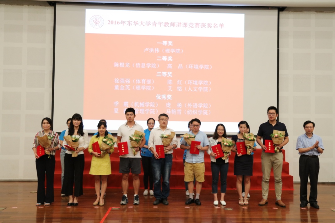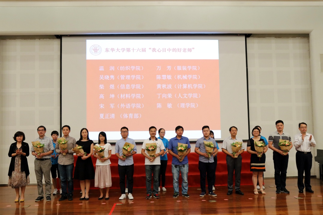 学校对过去一年在教学科研等领域获奖代表、第十六届“我心目中的好老师”、第八届青年教师讲课竞赛获奖选手以及从教30年的教职工代表进行了表彰。2016年上海市五一劳动奖章获得者、材料学院胡祖明教授,2016年上海市教书育人楷模、纺织学院邱夷平教授登台亮相,接过了满载敬意和谢意的献花。第十六届“我心目中的好老师”荣誉称号获得者也走上奖台。11位从学校青年教师讲课竞赛中脱颖而出的“讲课达人”通过视频再现教学风采和分享教学体悟。当从教30年的教职工代表走上奖台时,会议庆祝气氛被推向了高潮,校长蒋昌俊向教职工代表颁发了证书和专门定制的纪念章。