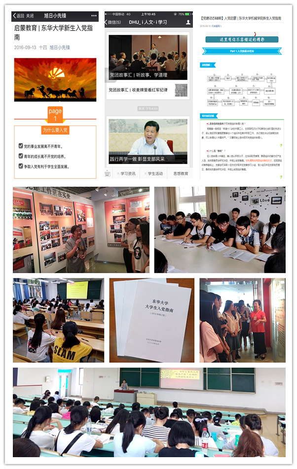 我校依托网络、微信、易班等平台,积极拓展线上教育途径,开展入党启蒙教育。计算机学院、环境学院分别组织新生在线观看宣传片《中国共产党和你一起在路上》和《那年那兔那些事儿》,以爱国爱党的教育予以新生启迪;管理学院、机械学院根据新生特点,积极利用微信公众号“旭日小先锋”、“机械星期八”,讲解相关党建知识,将入党启蒙教育融入新生日常生活;人文学院努力打造“易班名师工作室”平台,开设党建专栏,为新生线上答疑……