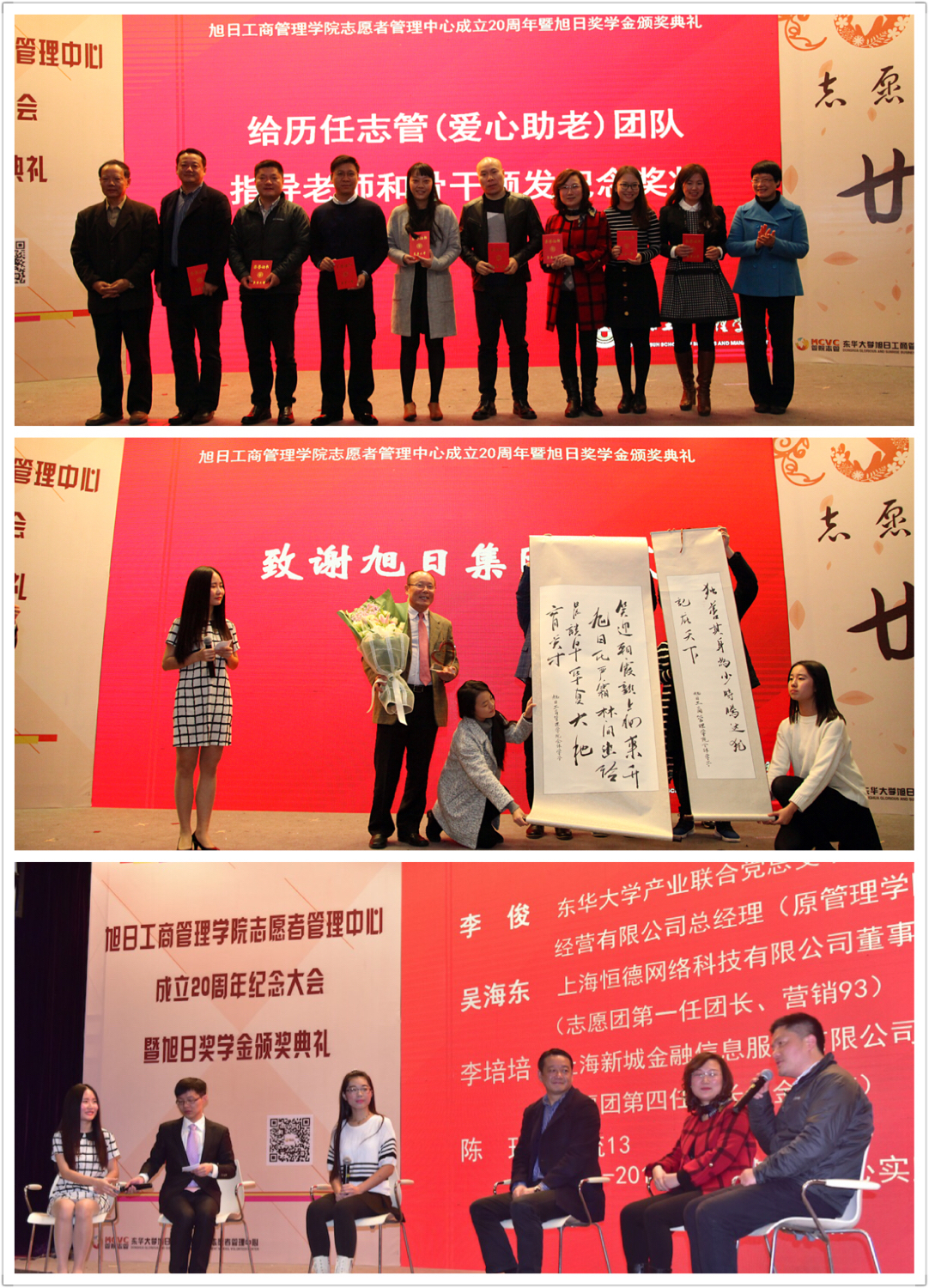据悉,成立于1996年12月31日的旭日工商管理学院爱心助老志愿团于2005年发展壮大为管院志愿者管理中心,如今已拥有爱心助残、辅助办公、互助讲解、互助教学、敬老尊长和社区帮扶6大类42项常规志愿者服务活动。1998年,时任校党委副书记兼副校长吴楚武曾为爱心助老志愿团题词“夕阳中飘扬一面年轻的旗帜”。二十年来,该学生组织获得了100多项校级以上荣誉,包括上海市老龄委颁发的上海市第一批(共5家)“爱心助老特色基地”称号、“上海市教育系统精神文明建设好事”、“上海市十佳爱心助老特色基地”提名奖、友邦项目全国十强、长宁区优秀青年志愿者项目等。