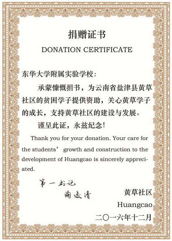 黄草社区给附属实验学校的捐赠证书