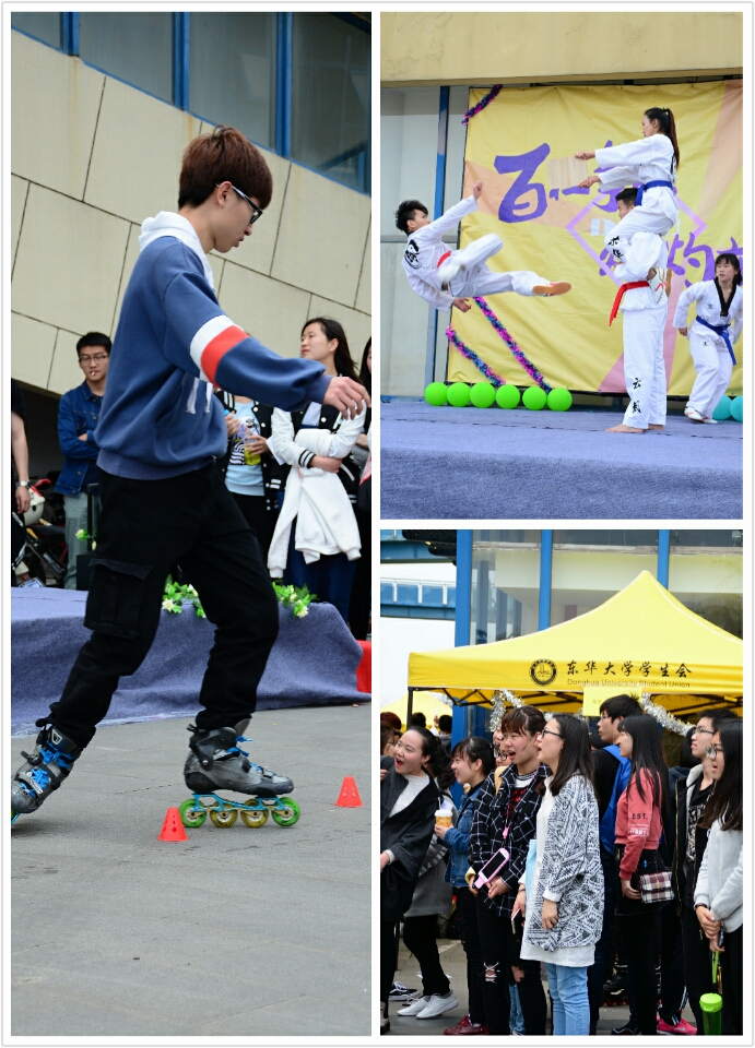 在开幕式的集中展示上,各个学生社团都展示着自己的特色:汉服社不仅带来了中国传统技巧游戏投壶,还展示了各种汉服配饰,增加了同学们对汉服这一中华传统物质文化的了解;创物手作社提供了材料给大家DIY插花和水纹明信片,让大家体验与感受自己动手的乐趣;清风棋社现场摆上围棋、象棋、五子棋的棋子、棋盘,吸引众多同学前来对弈;工业设计协会摆上了玲琅满目的手工艺品,邀请同学们亲身来体验制作;科创未来智能实验室和机器人社摆出了遥控机器人和机器小车,能跳舞能道理的智能机器人引得围观群众们拍手叫绝;魔方社学长学姐们用魔方摆出的精美图案和他们还原魔方时那快如飞的手速让观众们眼花缭乱,拍手叫好;步之火舞街舞社热辣的舞姿转眼间便吸引了一大群人向舞台集中,热情的音乐配上投入的表演,让大家感受到了街舞独有的魅力;云武跆拳道社的表演刚柔并济,叠罗汉、飞踢木板等表演,引得台下叫好声一片;ACE魔术协会的精彩魔术表演,更是让大家都目不转睛;轮之舞轮滑社的表演惊险刺激,轮滑飞跃六人、单脚独立支撑、下蹲滑行令全场观众都赞叹不已。各个社团的表演异彩纷呈,让驻足的师生收获满满。