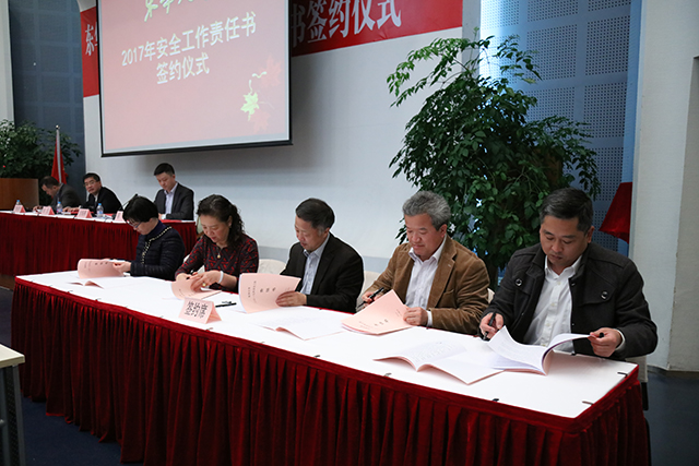 金海燕代表学校作2016年安全工作总结报告,并代表学校与各学院代表签订了2017年安全工作责任书。李永智宣读2016年安全文明单位和先进个人名单。