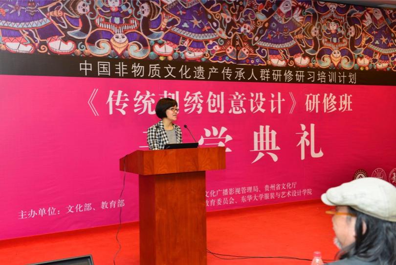 杨庆红在致辞中肯定了本次由与贵州省文化厅携手打造的非物质文化遗产传承人研修班在我国目前传统文化传承弘扬计划下的重要作用。李安鹏在致辞中表达了对本次研修班的深切期许,表示贵州也在着力打造由高校、企业、传承,相互形成三位一体的创新模式,打造新的贵州名片和贵州风情。贵州传统刺绣传承人、也是本次研修班班长高成春表达了对本民族刺绣文化的热爱,表示将带领来自于贵州的20多位资深绣娘在此次研修班期间一同认真学习与研究。冯信群代表学院致辞并表达了对贵州风土人情及传统文化的高度赞扬,表示研修班力求将贵州传统文化、技艺与东华创意、设计结合在一起,传承发展中国优秀传统文化。