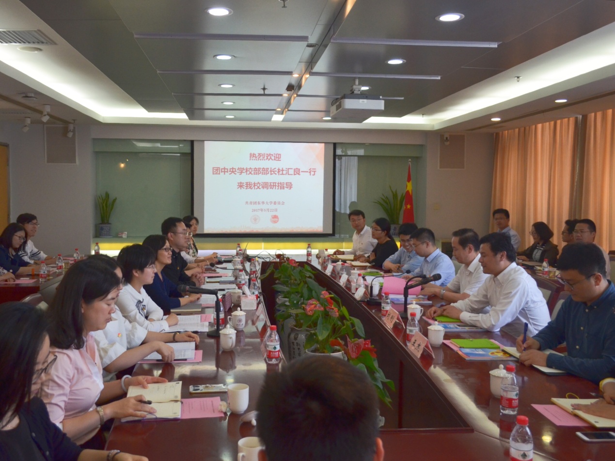 5月22日,共青团中央学校部部长杜汇良一行来我校调研共青团改革工作,共青团上海市委员会副书记刘刚、学校工作部副部长任浡、共青团中央学校部学联办干事王杰、上海市学生联合会执行主席陈黄超等陪同调研。我校党委副书记刘淑慧会见了杜汇良一行,学校全体专兼职团干部及青年教师、学生代表参加调研活动。