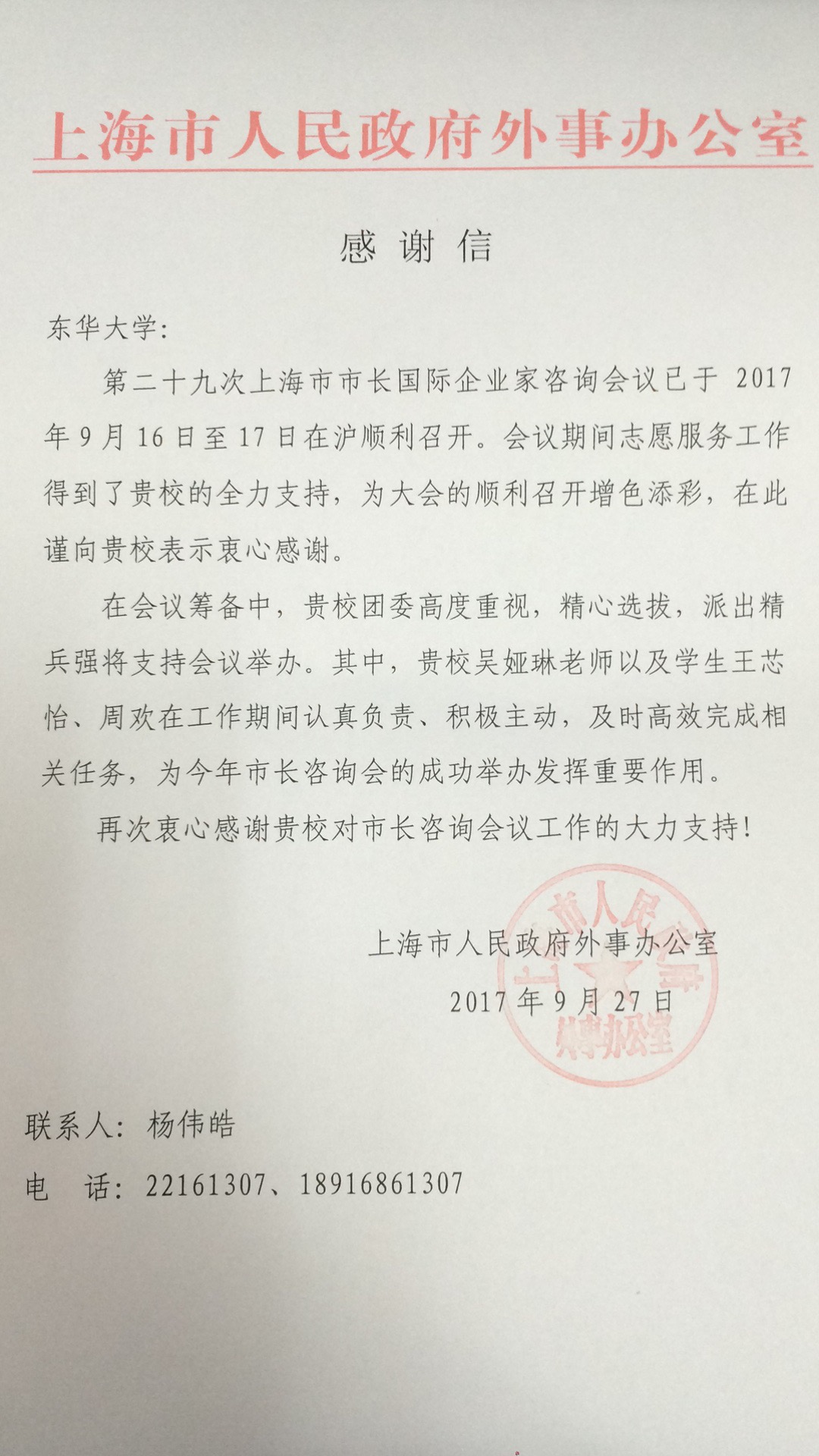 会前,上海市政府外事办通过团市委委派我校承担大会志愿服务工作。校团委高度重视,经过严格面试选拔,选派管理学院团委书记、辅导员吴娅琳至大会秘书处挂职,负责上海市市长国际企业家咨询会议纪念活动专项工作;选派外语学院本科生王芯怡、化工生物学院本科生周欢为会议长期志愿者,参与外方嘉宾联络以及大会内部协调联络等工作;选派环境学院本科生邱靖涵、材料学院研究生彭璇等9名学生为会议短期志愿者,分别参与市长咨询会上海大世界会外活动和世博中心主会场相关工作。他们准时到岗、微笑热情服务、与外方嘉宾的友好引导与接待,成为大会的一道亮丽风景线,以饱满的工作热情展现了师生良好的精神面貌,得到大会秘书处和外方嘉宾一致肯定和好评。