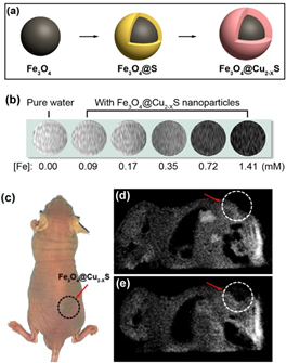 图2. 多功能Fe3O4@Cu2-xS核-壳结构纳米粒子的合成路线示意图及其体内外核磁成像