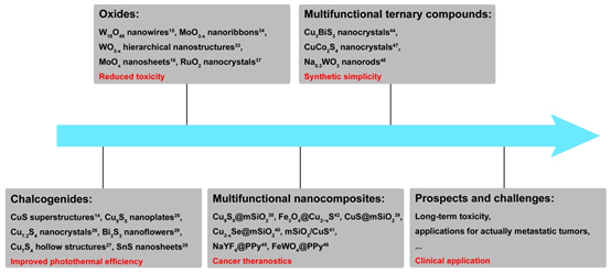 尽管医疗技术发展迅速,但癌症仍然是人类生存的巨大威胁。光热治疗(PTT)是一种用于癌症治疗的微创方法,选择性好、不损害正常细胞。近来,由于近红外区域(NIR)的吸光度强,光热转换效率高,因此铜硫族化物半导体成为极具前景的光热剂。然而,有效PTT的最小激光功率强度仍然显著高于人类皮肤暴露的保守极限。提高光热转换效率和降低激光功率密度已成为PTT发展的方向。此外,为了提高治疗效果,可将光热剂与造影剂或者抗肿瘤药物、光敏剂和放射增敏剂整合,以制备许多多功能纳米体系,从而获得诊断治疗一体化和联合治疗的协同效应。