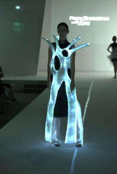 将海派文化与高新技术及材料结合的科技旗袍,靠的是“智能纤维”。智能纤维是指能感知外界环境(机械、热、光、湿度等)或内部状态所发生的变化,并做出及时响应的纤维。今年曾亮相英国爱丁堡艺术节的科技旗袍采用光纤、OLED等发光线条与图形设计方法,将海派文化与变形、变色、发光材料,激光雕刻与切割等多种科技元素相结合,模特们优美的身姿与交替变幻的音乐灯光摇曳相应,展示了国内前沿科技,向世界传播了上海的时尚流行及东华的智慧力量。