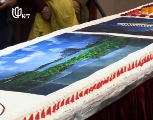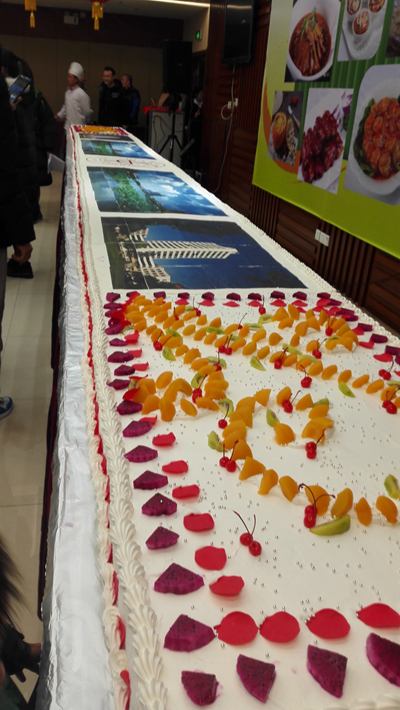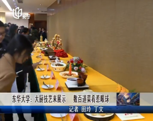 记者在厨艺展示现场看到数百道出自学校食堂大厨之手的菜肴让人垂涎欲滴。金牌蒜香排骨、招牌菊花鱼、培根肉卷、糯米藕丸等色香味俱全的菜肴让人忍不住想赶紧吃上一口。再看紫麻球、莲蓉酥饼、椰香地瓜团等点心也让人忍不住看着就直咽口水。而最引人注目的眼前这个印有“”logo和延安路校区、松江校区标志性建筑的大型蛋糕,蛋糕长度为9米,宽度为0.8米,延安路校区的教学大楼和松江校区的图文信息大楼分别位于“”的两侧,显得气势磅礴,相得益彰。