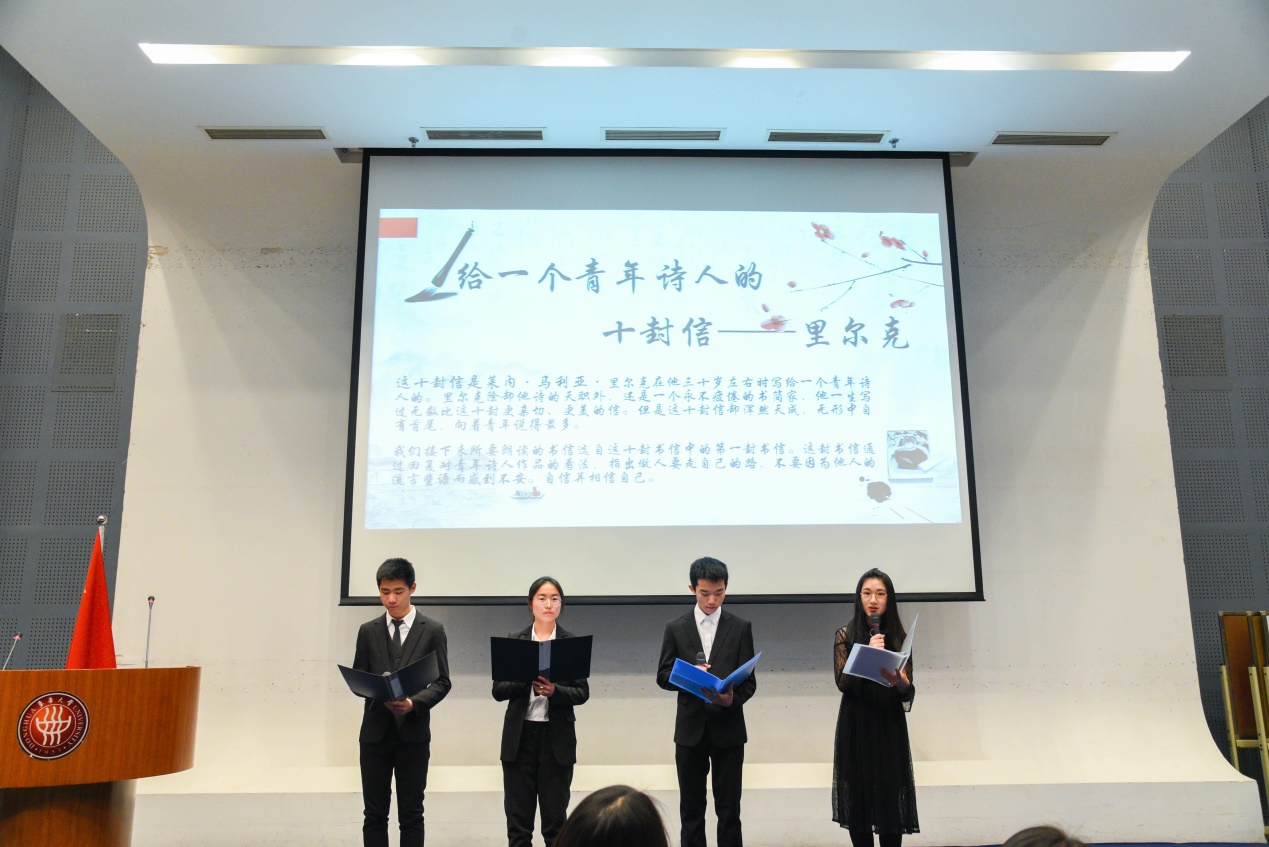 活动现场,同学们依次演绎《与妻书》、《亲爱的安德烈给河马的信》、《给一个青年诗人的十封信》、《文化苦旅》、《传古文髓》、《我们在科技的春里起航》等作品。这些篇目从人文情怀到自然景观,从国之大策,到生活点滴,从青年成才到大国重器,有的动人之深,有的慷慨激昂,有的彰显伟人智慧,有的富含历史底蕴。在展望未来部分,年度人物提名获得者雷涛作《青春逐梦,强军强国》的演讲,雷涛同志的豪情壮志和踏实奋进,鼓舞青年人紧跟时代,且思且行,一言一行,不忘初心,笃行逐梦未来。