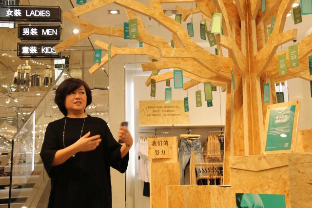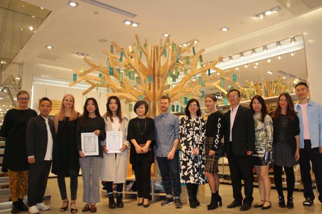 刘春红与汉娜·哈琳(Hanna Hallin)共同为本次店中店设计获奖作品“重焕新生”颁奖,该作品也应用在H&M南京西路旗舰店中。“我们的作品从顾客的环保心理研究出发,结合H&M的环保理念,意在将废旧的物料通过‘装置树’变为肥料,滋养树继而树长出树叶,具体互动形式为绿色的丝带,由顾客绑到装置树上,让消费者参与其中,促使这个环保活动的进行。”服装学院时尚室内设计专业三年级学生张若茜、王悦向在场嘉宾介绍作品创作过程。
