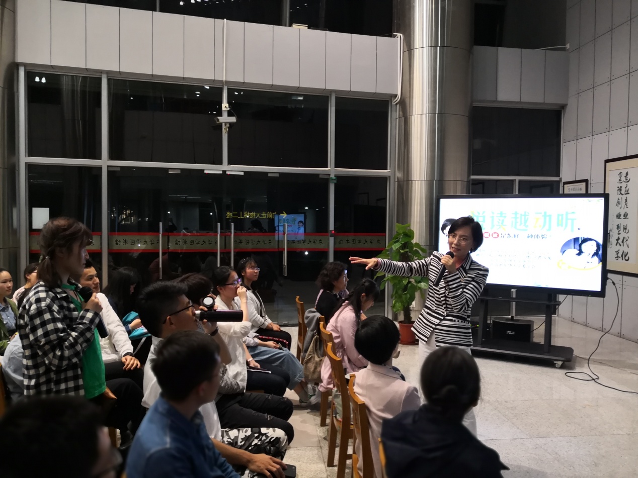 丁薇女士从三个关键词深度理解“悦读”。一是要从“阅读”行为中获得快乐、真实的体验;二是,要从“分享”行为过程中树立对阅读习惯的认同;三是要从“朗读”行为中将阅读体验予以形象化表达。讲座中,主持人协会、广播台、东华朗诵团、镜月诗社以及参与“东华朗读者”世界读书日系列活动的师生还现场朗读相关语料,由丁薇女士作朗读技巧指导。丁薇老师一一点评,高度认可了同学们朗读基础训练,并现场邀请东华师生参与“悦读越动听”节目录制。