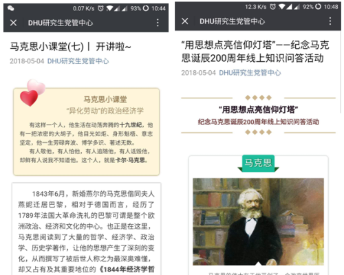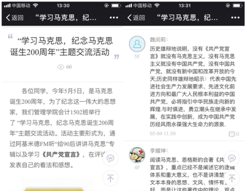 此外,为纪念马克思诞辰200周年、《共产党宣言》发表170周年,学校还开展了形式多样的主题教育活动。人文学院开展青年与《共产党宣言》主题论坛活动,青年党员们围绕主题进行热烈的交流讨论。马克思主义学院组织青年教师围绕如何推进习近平新时代中国特色社会主义思想进课堂进学生头脑展开教学研讨。校团委组织青年马克思主义者培养工程的团学骨干集中讨论学习《共产党宣言》。管理学院在易班平台开展“学习马克思,纪念马克思诞辰200周年主题交流活动”,师生纷纷留言发表感想。研究生党管中心利用微信公众号推出“用思想点亮信仰灯塔——纪念马克思诞辰200周年线上知识问答活动”,连续推出七期微党课《走近马克思》,向广大师生积极传播马克思主义。