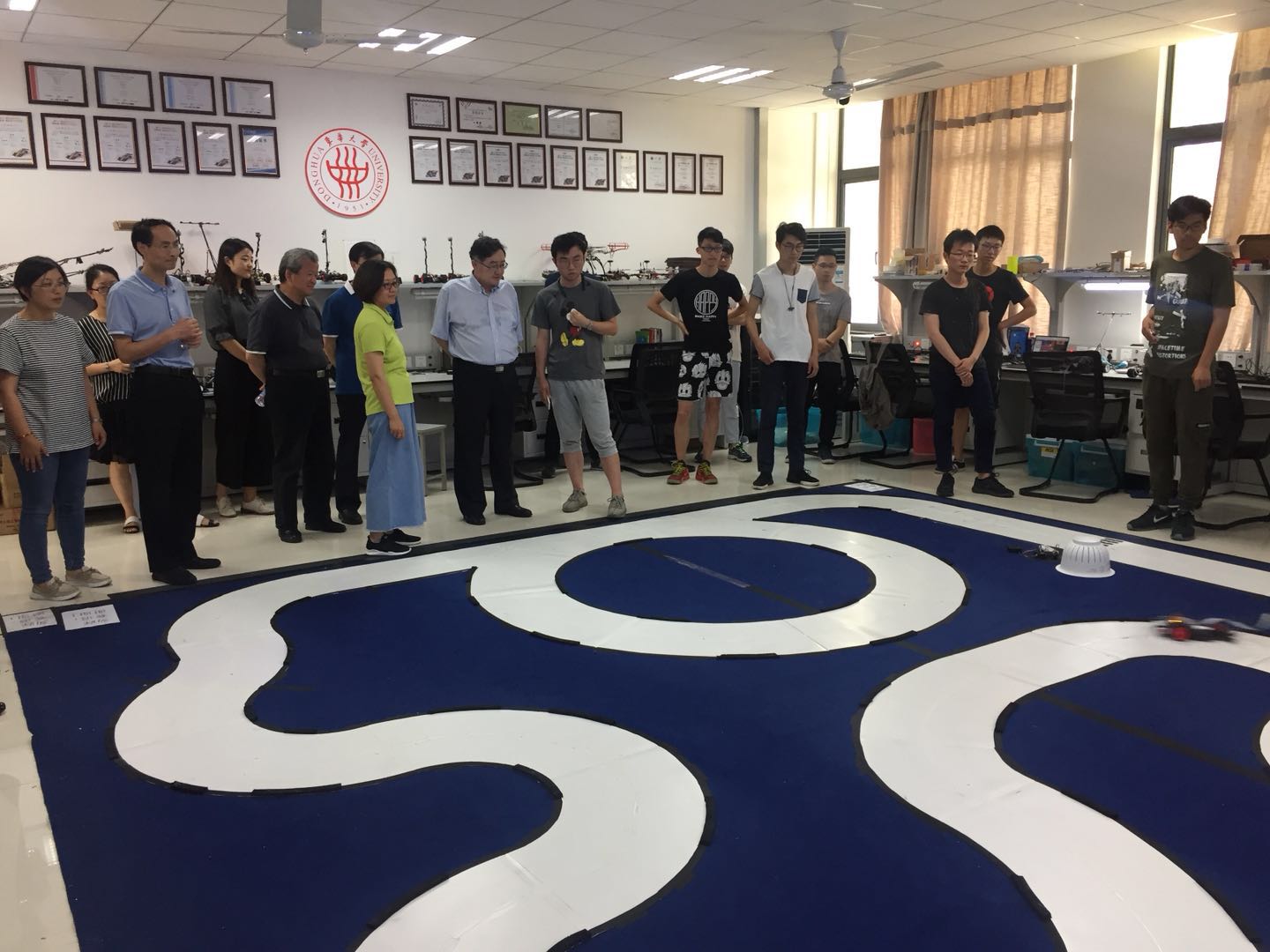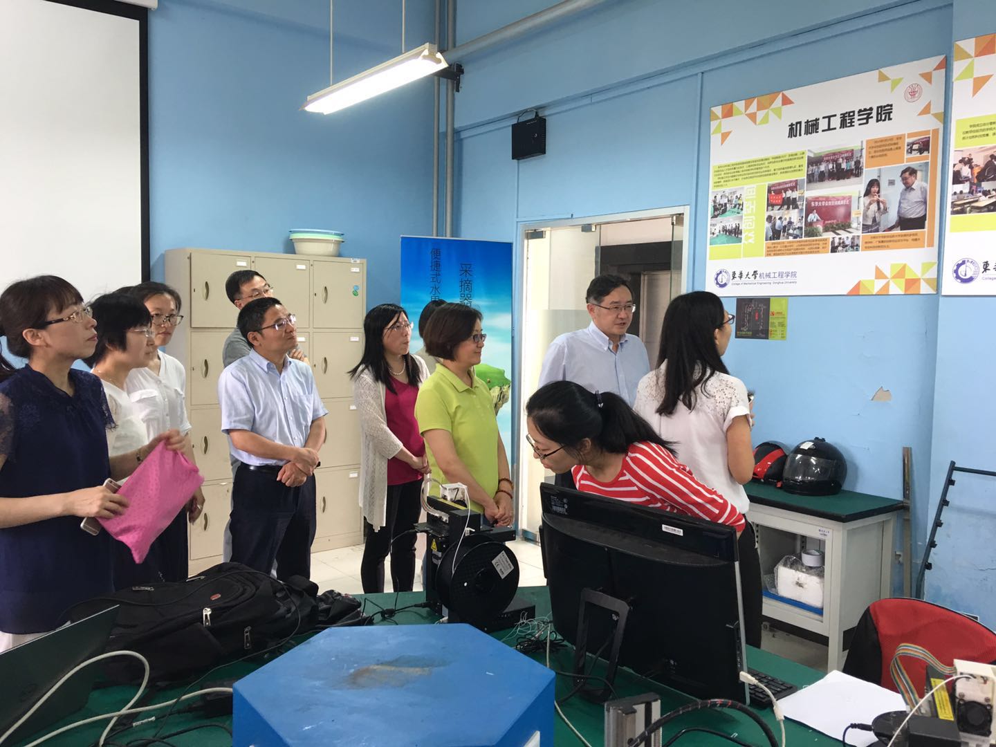 蒋昌俊一行来到位于机械学院一楼、四楼和六楼的创客工坊——创新创业实训基地,关切询问学院创新创业教育发展情况,对机械学院重视创新创业能力培养以及学生在德国红点奖、国家挑战杯、全国大学生机器人大赛、全国大学生节能车大赛等重要赛事中屡获佳绩给予充分肯定。在参观学生创新创业作品时,蒋昌俊强调要重视学科交叉,将机械学院的工业设计与服装学院的产品设计有机结合,充分发挥学校资源优势,展示东华教育特色。