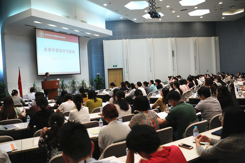 “业余作者能写出好新闻吗?35年记者生涯告诉我:答案是肯定的。” 7月9日,在由党委宣传部主办的2018年新闻媒介素养培训班(以下简称为“培训班”)上,光明日报上海记者站站长曹继军结合从业经历与东华老师做了一次生动分享。百余名教职工聆听讲座。这也是我校首次面向全校新闻信息员、专职党务干部和校院二级官方校园媒体指导教师开展的系统培训。