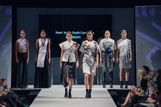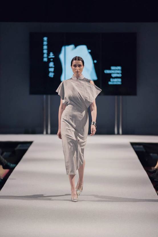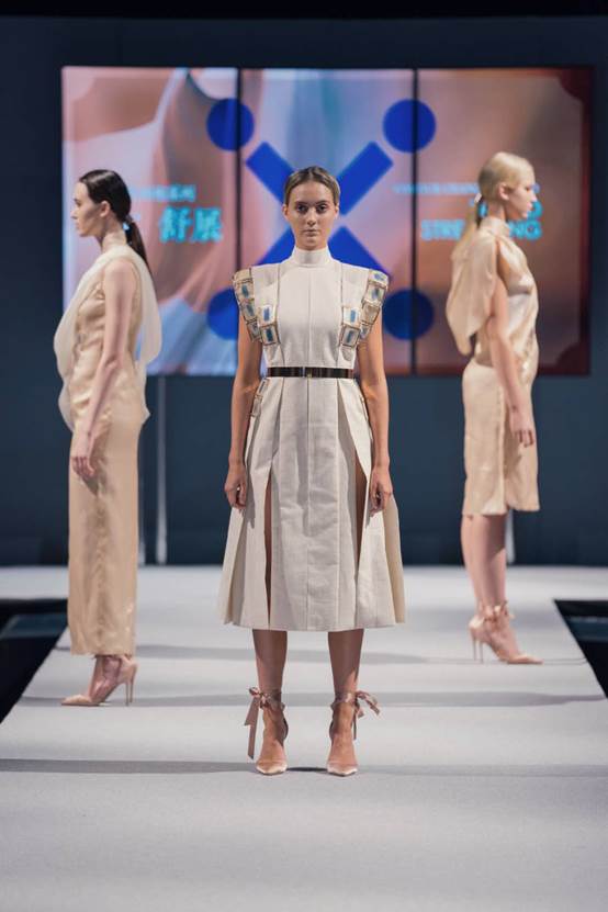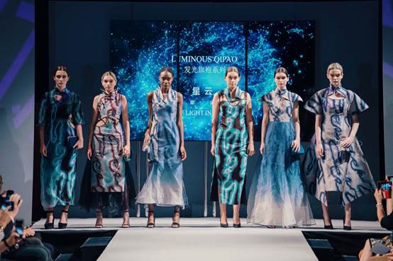 “科技未来:‘金木水火土’海派科技旗袍秀”,来自跨学科、多层次、国际化的校企合作团队,围绕“金木水火土 Shifting | 转化”的设计主题,将五行元素为代表的中国古代哲学思想与海派文化结合,并将发光材料、记忆金属、电致变色、激光雕刻与切割、医疗健康等科技元素结合应用,对未来海派时尚旗袍进行创新畅想,演绎出融合时尚、科技与文化的旗袍盛宴。