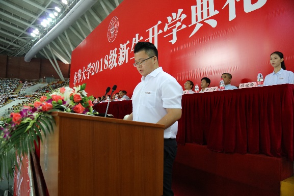机械工程学院2017级研究生徐少东代表全体学长学姐欢迎新东华人的到来,结合自己在六年的经历与所感所悟分享了他的求学之道。“学习不是一种任务,而是一种态度。大学的精彩在于不断去探索、去尝试、去体验。”徐少东从“做一名永不掉队的东华人”、“做一名有担当的东华人”两方面鼓励学弟学妹们能够做一名有气质、有格局、有担当的新时代东华人。