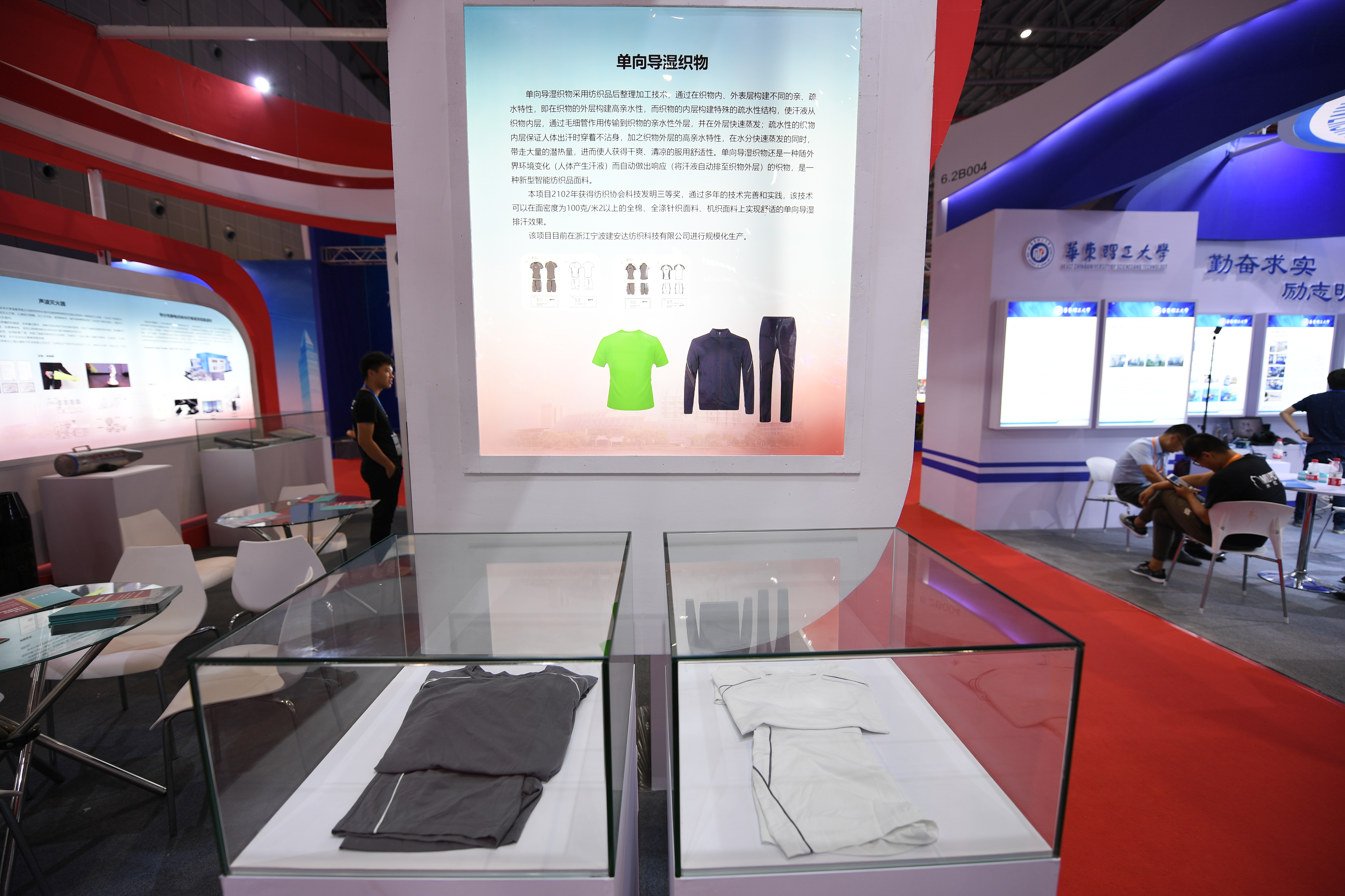 化工生物学院副教授闵洁团队此次也带来了智能纺织品面料成果,所不同的是,他们聚焦的是薄型服装面料的单向导湿排汗效果的实现,团队所研发的单向导湿织物,能够让汗水迅速地排到面料外侧,保证面料人体内侧的干爽舒适性;考虑到国人喜欢穿着全棉服装面料习惯,该项技术可以在全棉薄型面料上(100到110克/㎡)实现水份的单向输送效果,让使用者获得更高的热湿舒适性穿着效果,该项目获得了纺织协会纺织之光科技发明三等奖,目前已实现规模化生产。