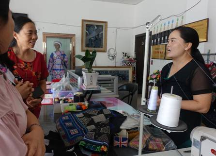 如果说陈梅是用“时尚”和“创新”让非遗焕发新活力,那么印苗刺绣技艺传承人王万菊则是用“坚守”和“传统”让非遗技艺保留“原汁原味”。家住龙里县哪旁乡石板滩村高寨的王万菊,是非遗传承人群培训班第一期学员,她几十年来一直怀着“让印苗文化一代代传承下去”的理念,执着地在当地传承印苗文化。如今她已是贵州省龙里县苗之印手工艺品专业合作社的负责人,带领苗家妇女做传统印苗刺绣服饰。乐观开朗的王万菊特别开心地告诉我们,她的苗之印服装还卖到了东南亚,新加坡一张订单就卖出了80套,泰国也定制了12套,精美绝伦的刺绣工艺让传统服饰有底气地走出国门。由于普通话并不流利,王万菊在东华参加研修时甚是少言,但她说:“我虽然不太讲话,但我用耳朵听,用笔头记,在东华听课时好想法、好创意,我记了满满一本子呢。”坚守传统但也不能一成不变,王万菊从东华回来之后也开始探索设计创作,将生活中、印苗文化中的元素巧妙融入传统服饰。在高寨,王万菊不仅是非遗传承人,更是“创业致富带头人”,她经营的合作社2017年净利润80万,今年截止到7月净利润已达60万。“我有一个小小梦想”,临别之际王万菊感慨地说:“五年后请老师们再来,我会建成一个印苗文化中心,有一个印苗文化展览馆,一个印苗文化传习馆,还有休闲娱乐赏景的地方,让来高寨的客人可以在此歇一歇,全都规划好了。这可是去东华培训回来做出的决定哟!”