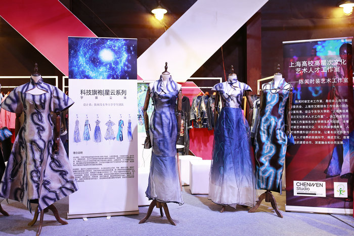 在10月26日开幕的中国国际时装周设计汇(DHUB)上,标注着“上海高校高层次文化艺术人才工作室——陈闻时装艺术工作室”标题的展位前人头攒涌,由著名设计师陈闻带领东华师生设计的“星云系列”科技旗袍和时装、崔玉梅及周洪雷老师带领师生创作的创意童装以及校服,引发了业界的极大关注。该工作室由陈闻工作室和师生共同组建,是经由上海市教委和上海市文教结合工作协调小组办公室批准,设立于我校的上海高校高层次文化艺术人才工作室项目。本着时装艺术表现文化、文化内涵渗透教育、人才培养提升设计的宗旨,让著名设计师参与高校人才培养的环节,推进文化、教育事业的紧密合作、深度融合和协同发展。