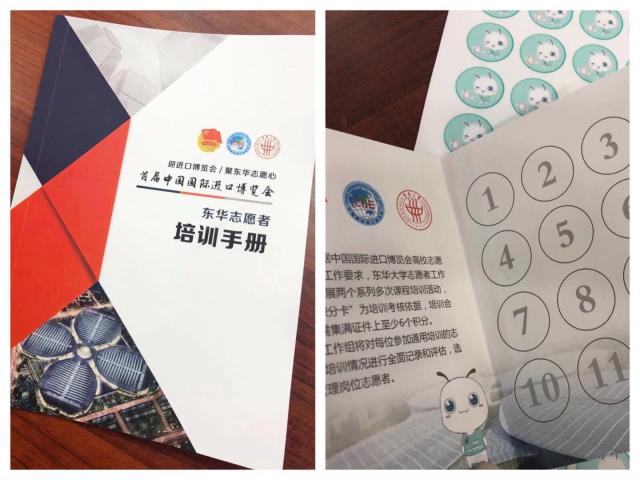 以“迎进口博览会,聚东华志愿心”为培训主题,制定了培训方案,设计全校性通用培训和集中性专业培训两个部分,汇编《培训手册》,包含“奉献·中国国际进口博览会”“友爱·志愿者精神的传承”“互助·志愿者通讯录”“进步·综合能力提升”四个篇章。同时,引入培训“积分卡”,积分卡具有唯一性,留有12处空白,用以张贴每次培训活动发放的积分贴纸,对志愿者参与校内通用培训和市级重点系列培训的情况进行全面记录和评估,是志愿者们的上岗凭证,也是后期选拔管理岗位志愿者的依据之一。