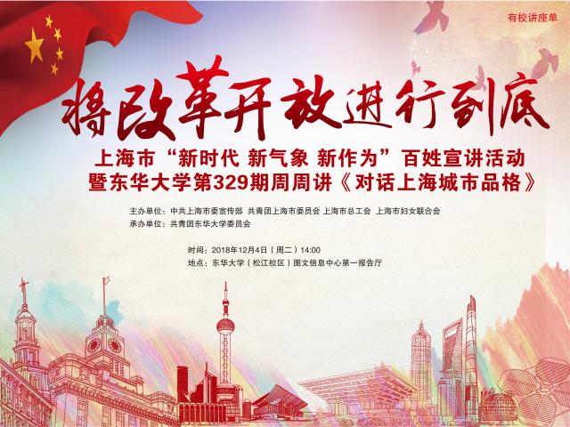 庆祝改革开放四十周年,大力营造团结奋进的浓厚氛围,根据《中共中央宣传部等关于组织开展“新时代新气象新作为”百姓宣讲活动的通知》(中宣发〔2018〕13号)要求,市委宣传部、市总工会、团市委、市妇联等单位将联合开展以“将改革开放进行到底”为主题的上海市“新时代新气象新作为”百姓宣讲活动,本次活动由共青团委员会承办,作为我校第329期周周讲“对话上海城市品格”。系列主讲人将结合“开放”“创新”“包容”的城市品格,结合自贸区、科创中心建设等青年一线工作、理论研究、进博会志愿者经历等,从真实故事出发,阐述对上海城市品格、上海城市精神的理解。