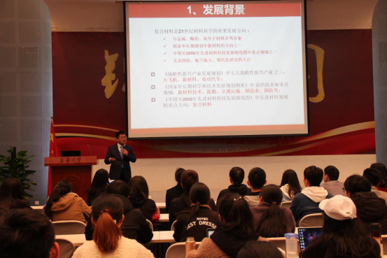 课上,孙宝忠教授讲授了碳纤维复合材料的发展背景和应用等知识,他谈到,“碳纤维复合材料的进步是顺应国家经济高速发展、满足国家航空航天和工业需求的必然要求”。发展碳纤维复合材料,对我国加快建设创新型国家,提高科技实力具有重要意义。他说,复合材料是当今最有实力去担当新一代先进制造业重任的材料,是先进装备制造业的创新基石。碳纤维复合型材料的发展,瞄准于世界科技前沿,获得了引领性原创成果的重大突破,为建设科技强国、质量强国、航天强国、网络强国、交通强国、数字中国、智慧社会提供了有力的科技支撑。像今天人们熟知的国之重器——C919国产大飞机、复兴号高铁,都离不开碳纤维复合型材料的技术支撑。