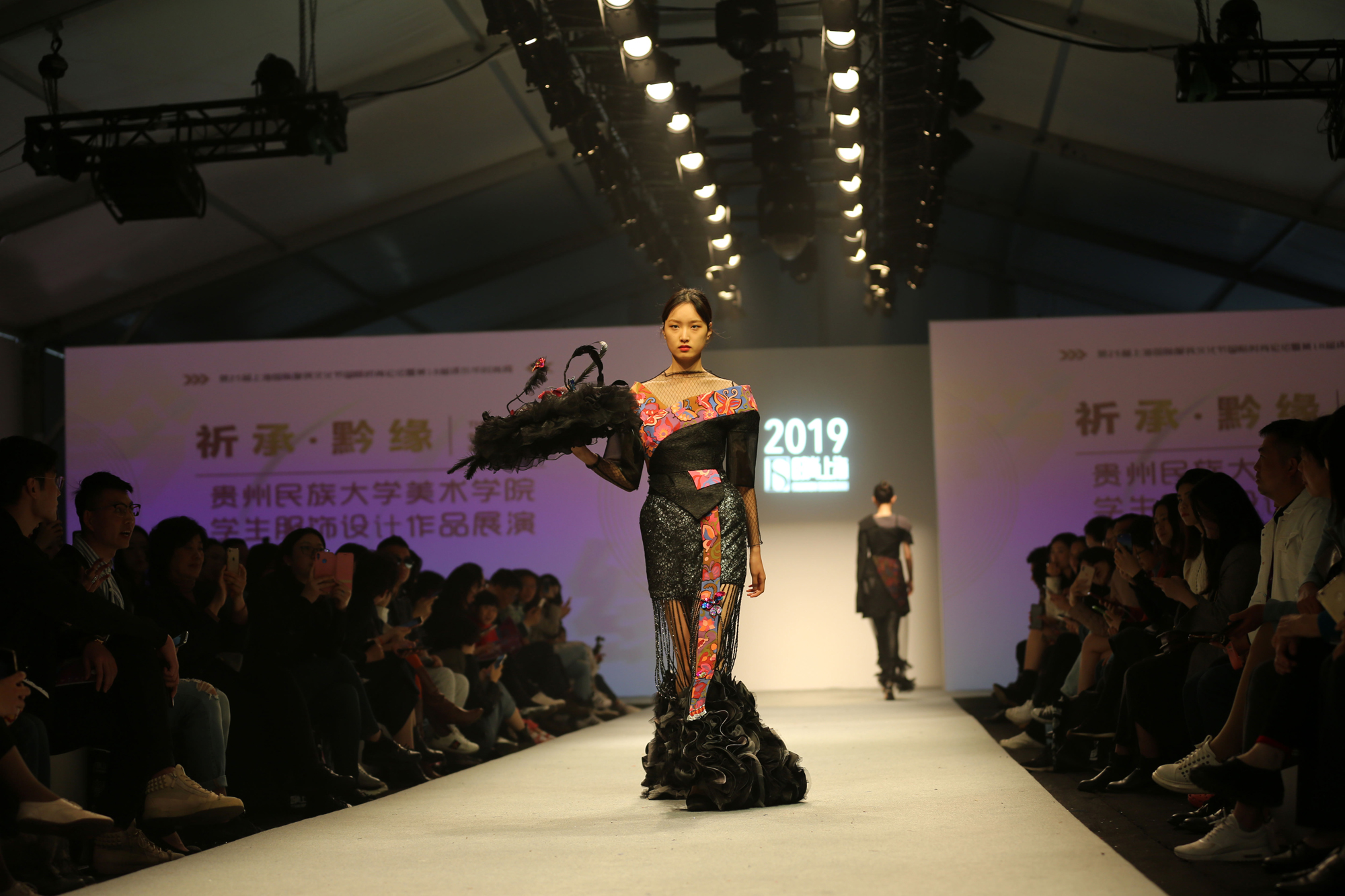 贵州民族大学动态秀演了苗族、布依族、侗族、水族、彝族等地区的少数民族原生态服饰。其中,《黔·行》作品以对民族元素的深刻理解和创新精神赢得了现场好评——服装制作工艺用的是破线绣、缠筋绣、打籽绣等苗族传统技法,但在设计上则结合了2019年流行职业女装进行的二次原创设计,以大廓形为主增加服装体量感,主打风格是优雅知性的轻奢风格。作者2019届毕业生设计师张萍萍在立足本土苗族文化底蕴的基础上,接收一些新的时尚风向和艺术观念,“希望能通过自己的努力,让更多地人看到贵州的纹样不仅仅是鱼虫鸟,更多的是纹样图腾故事和承载的千年祝福;看到的贵州颜色不仅仅是花红柳绿,更多的是来自独特的人文风情和民族非物质文化。”