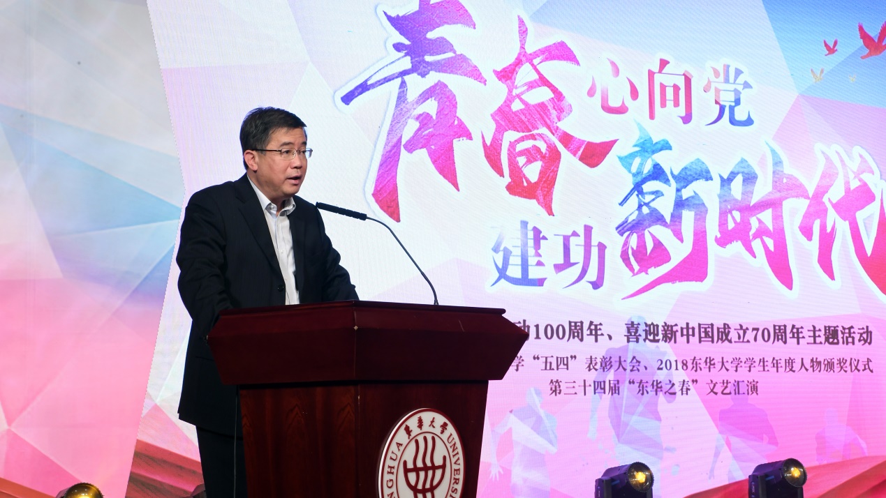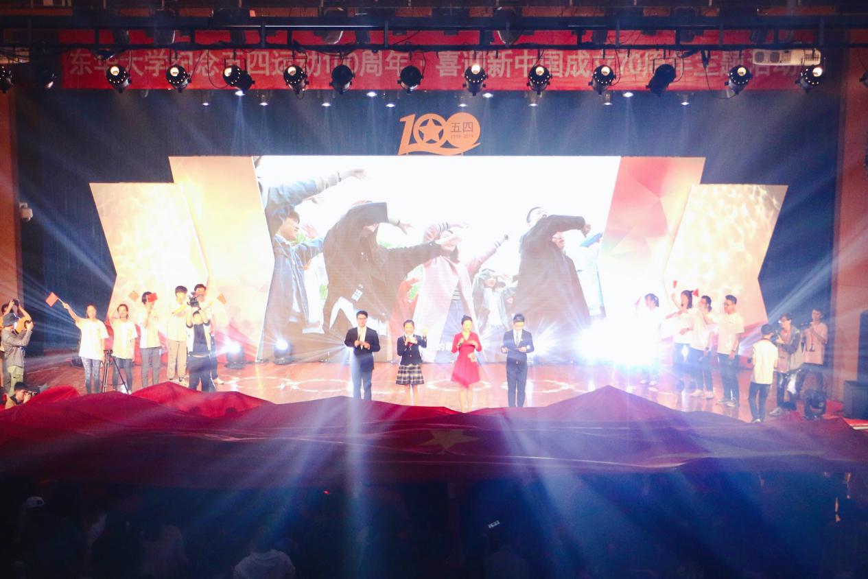 2018学生年度人物颁奖仪式及第三十四届“东华之春”文艺汇演在活动上同步举行。共10名学生获评2018学生年度人物、10人获提名奖。通过青春访谈的形式,“五四青年标兵”获得者陈宗杰同学分享了慷慨挽袖、无私奉献的献血故事,“共和国的同龄人”人文学院贺善侃教授对话青年教师,赢得师生阵阵掌声。最后,在“五四青年标兵集体”合唱团代表的领唱下,全场师生共同传递国旗,齐唱《我和我的祖国》,共同展现了东华青年同祖国一起前进、同人民一起奋斗的坚定信念和价值追求。