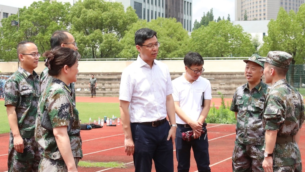 在延安路校区视察学生军训工作时,刘承功亲切慰问承训教官、带训辅导员和参训同学。他对教官的严格训练、带训辅导员的辛勤付出和同学们的刻苦训练表示肯定和赞扬。他强调,军训工作是学校重要工作之一,也是“三全育人”系统的重要环节。他希望各部门高度重视,不仅要让同学们掌握好基本军事知识和技能,更要培育爱国情怀、锤炼意志品格、强化纪律观念和集体主义精神。