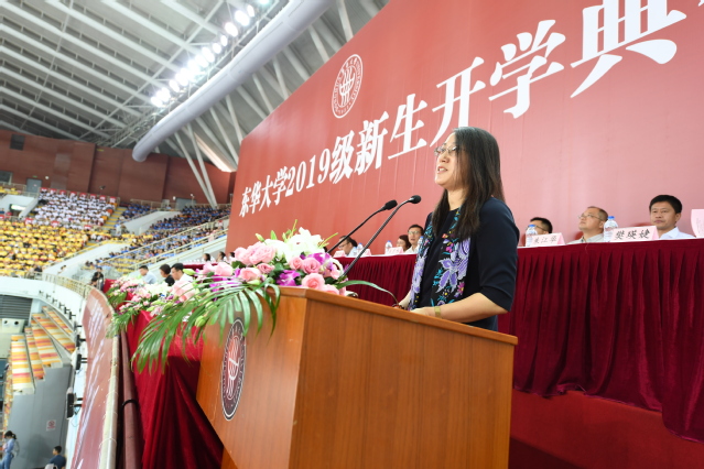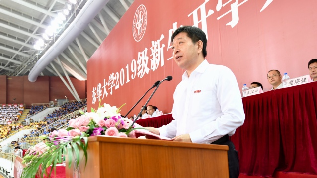 俞建勇代表全体师生员工欢迎2019级新同学加入东华大家庭,并以“‘小我’融入‘大我’:不负时代,不负青春”为题寄语新生。他说,自1951年建校以来,学校培养了一批又一批为国家和社会做出重要贡献的杰出人才,在纺织、服装、材料和设计等领域享有极高的社会声誉。他结合“学校科研攻关解决我国新型战略弹头防热层材料问题”、“学校科研成果成功应用于‘天宫’‘天舟’‘北斗’‘天通’’嫦娥’等国家重大战略”、“东华科技与时尚、东华设计与文化助力上海时尚之都、设计之都建设”等东华“闪光点”,激励新生爱校荣校,传承发扬“崇德博学、砺志尚实”的校训精神。