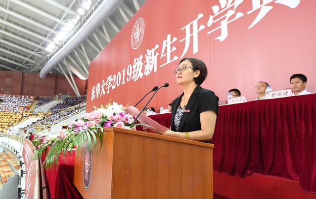 马克思主义学院党总支书记、院长王治东教授作为教师代表发言。她用一次“人生回眸”,带新生们领略了时代进步背后的强大推动力。她谈到,新时代让我们有更多的历史机遇和更广阔的发展空间,同时也面临着巨大的历史责任和时代发展期待,同学们要有真本领、有真才学,有正确的价值观、人生观和生命观。她还鼓励新生将个人发展与时代发展,做中国特色社会主义的积极建设者。