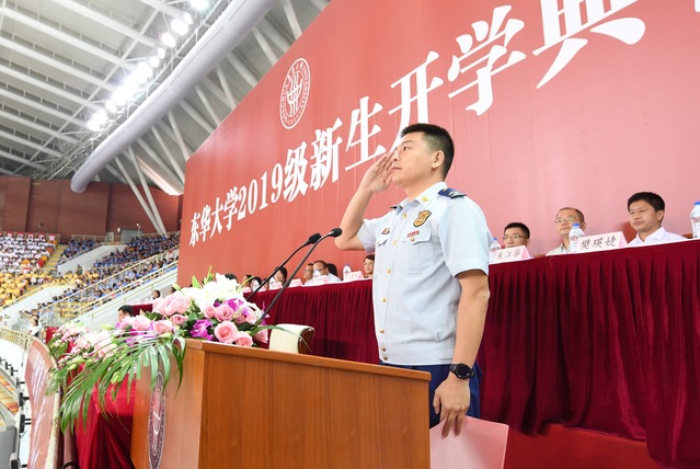 上海市宝山区消防救援支队一级指挥员周旭峰作为校友代表在开学典礼上赠言2019级新生。他以自己消防“逆行者”的工作经历和参军生活,诠释了一名军人爱岗敬业、舍己救人、保一方平安的崇高精神。他鼓励新生树立高远志向,厚植爱国情怀,涵养浩然之气,勇于砥砺奋斗,让责任和担当照亮梦想的航路。