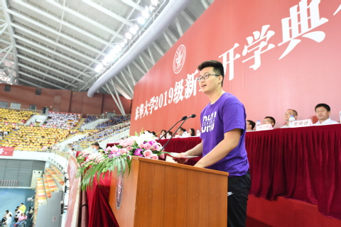 计算机科学与技术学院林佳豪作为新生代表发言。“我们要始终怀着一颗感恩的心,深切地爱着我们的祖国,自觉将自己的成长融入祖国发展和民族复兴的洪流,努力做一名有益于国家、有益于人民的新时代青年。”他倡议新生们积极响应习近平总书记对新时代青年的号召,爱国、励志、求真、力行,把青春写在民族复兴的伟大征程上。