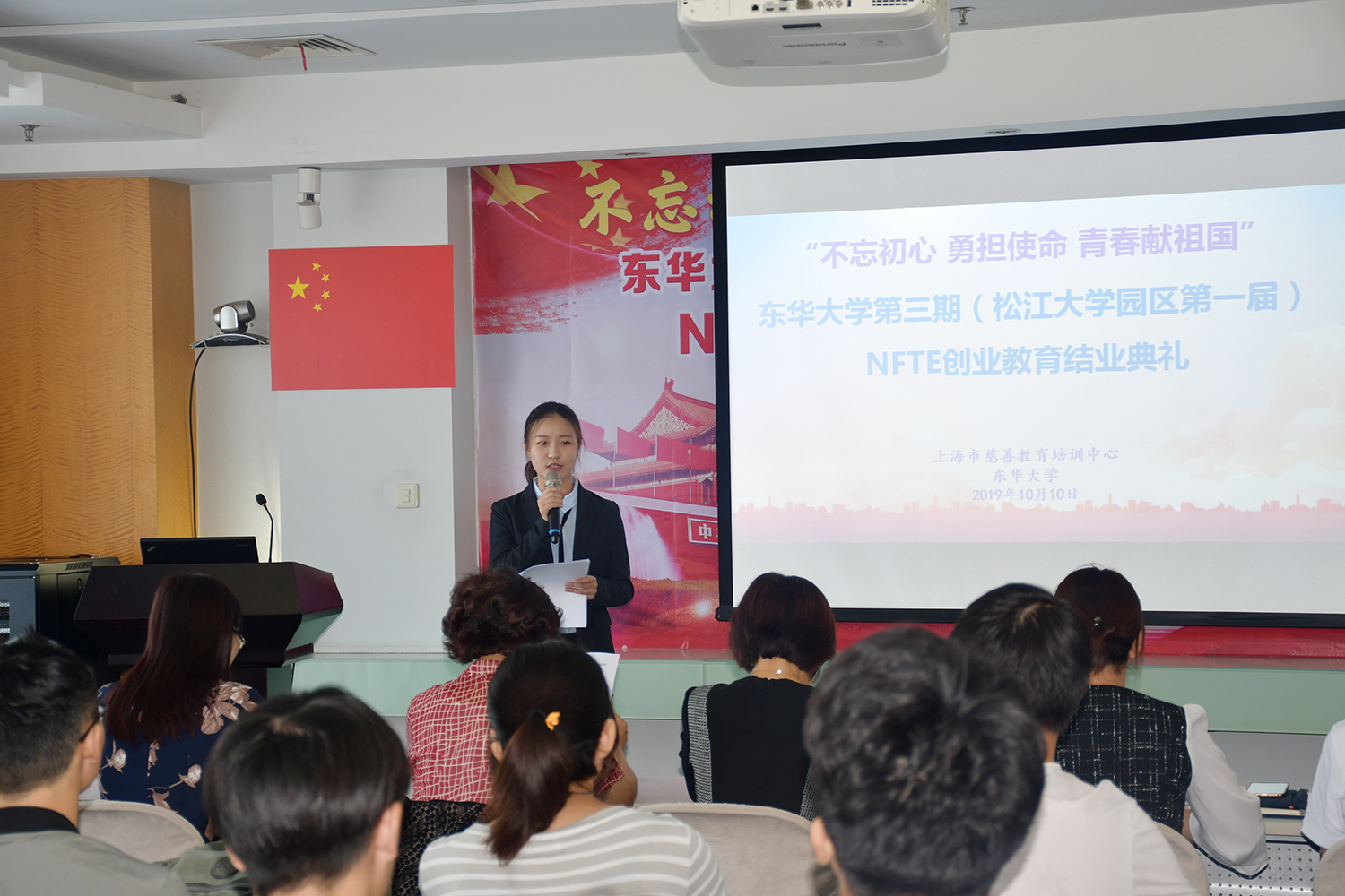 10月10日,“不忘初心 勇担使命 青春献祖国”第三期(松江大学园区第一届)NFTE创业培训结业典礼在松江校区举行。党委副书记刘淑慧,中国人力资源开发研究会专家委员会副主任、上海市慈善教育培训中心主任徐佩莉出席活动并讲话,上海市慈善教育培训中心、上海外国语大学、上海视觉艺术学院和我校相关部门负责人以及创业培训班41位结业学员共同参与典礼活动。