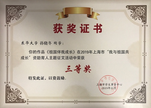 近日,从上海市学生事务中心传来喜讯,我校环境学院研究生解紫茹同学的《丰羽展翅 翱翔》和人文学院本科生孙晓冬同学的《祖国伴我成长》在上海市2019年“我与祖国共成长”资助育人主题征文活动(简称“主题征文活动”)中分获二、三等奖,我校荣获优秀组织奖。