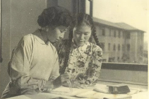 (黄宝妹学习工程制图,左一)