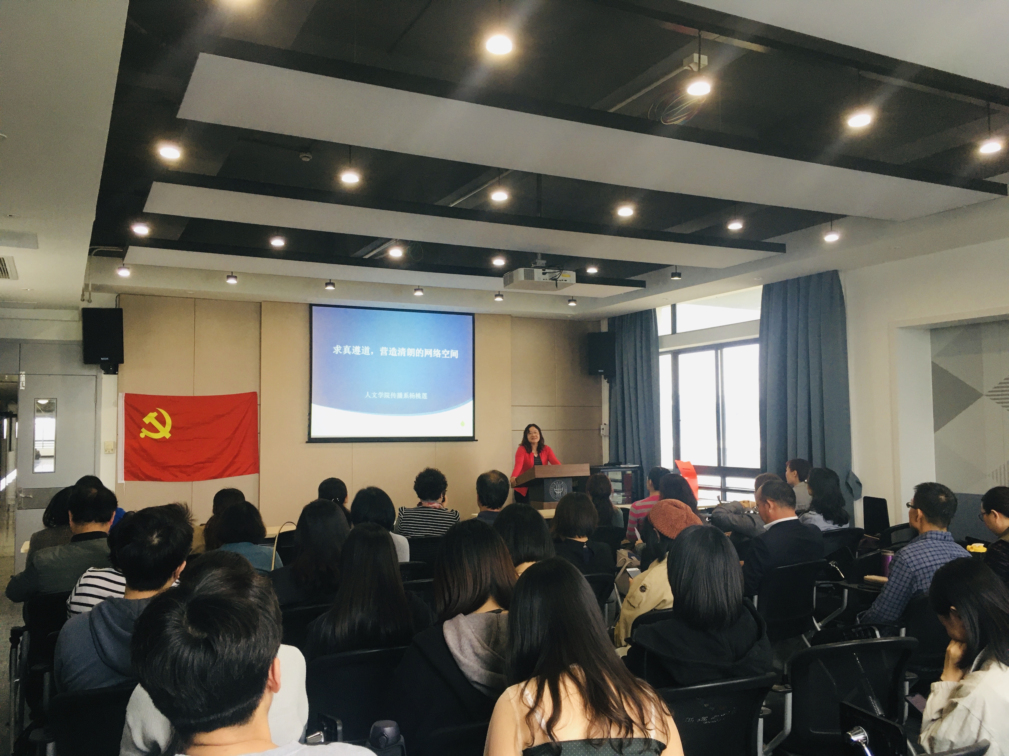 近日,“学用新思想,奋进新时代”宣讲团成员、人文学院副教授杨桃莲应邀为外语学院党委师生党员作题为“求真遵道,营造清朗的传播空间”专题讲座。